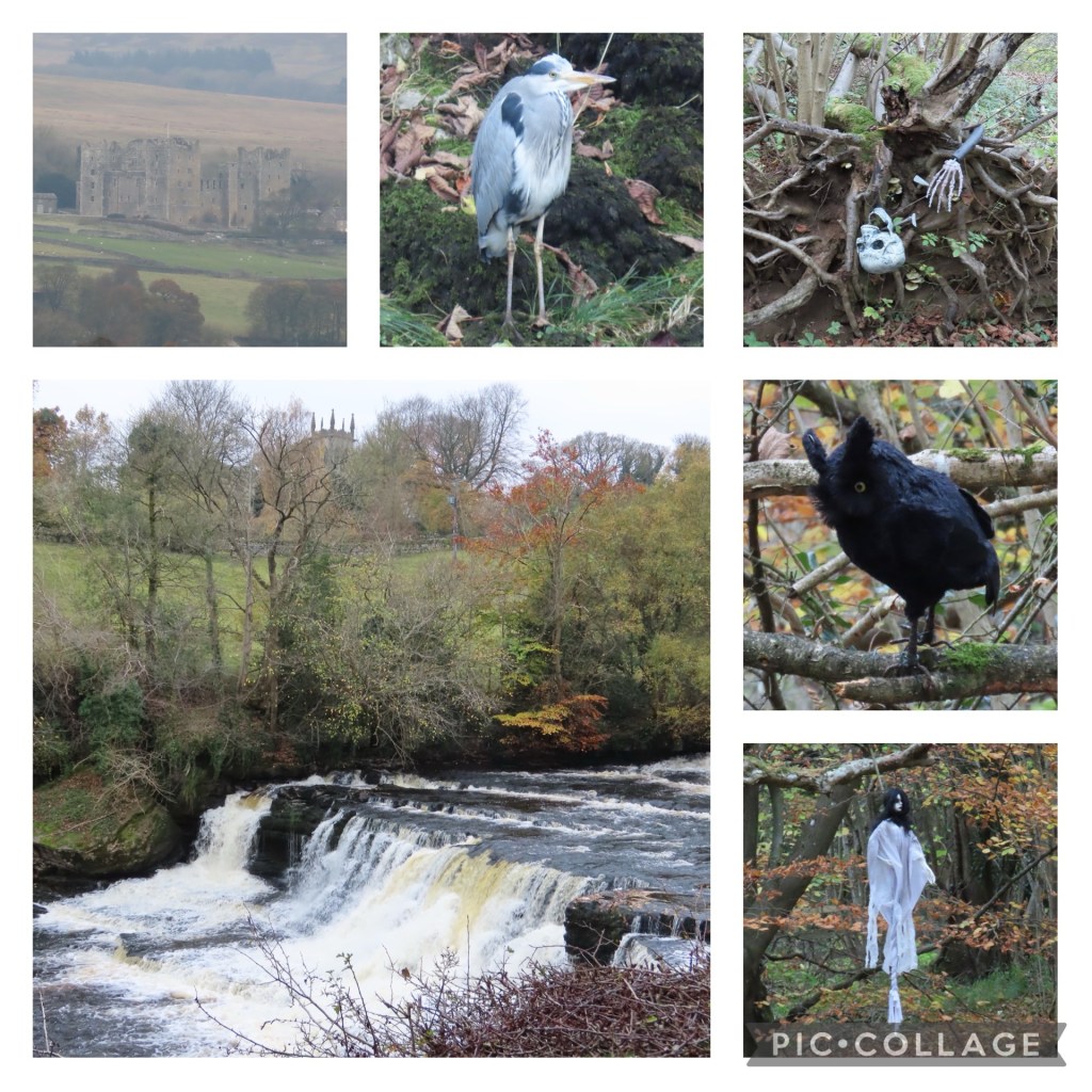 We travelled up to Grinton yesterday (04 November) with a lovely drive up the Dales following the Grassington Road from Skipton, through Cracoe & Kilnsey with it’s impressive Crag, Kettlewell, Starbotton, Buckden, Bishopdale, Newbiggin & West Burton… and, as we couldn’t check in until 4pm, decided to have a little stop and a stretch of our legs when we got to Aysgarth. We have stayed at the campsite in Aysgarth a few times so know the area a bit and decided to stop at the Aysgarth Falls Yorkshire Dales National Park visitor centre… there are a number of walks from the visitor centre there, and, in the part of the woods that go down to the river, they still had some of the Halloween decorations up (see photos below):