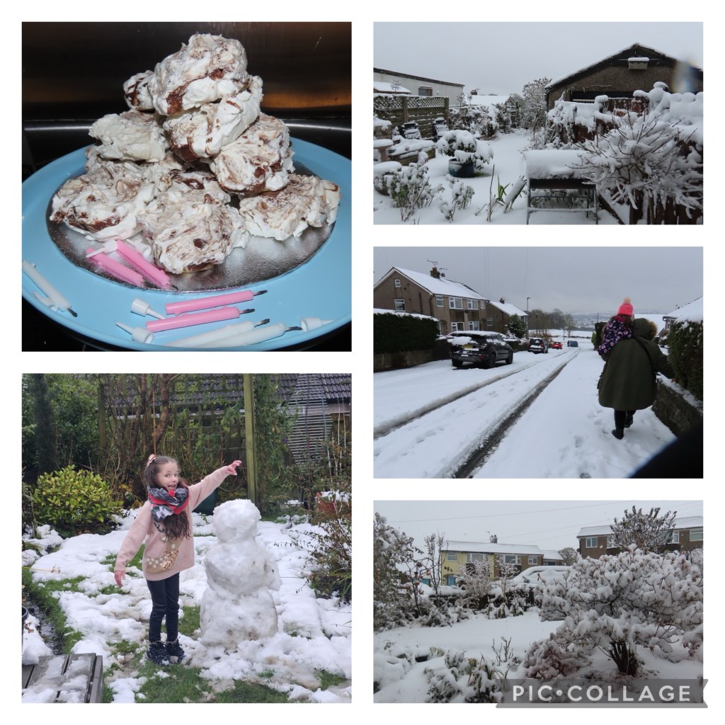 Top Left: My masterpiece birthday “cake” for Niamh! Nutella Meringues 🤣🤣! The snow that greeted us on Saturday morning! Bottom Left: Niamh’s masterpiece snowman!