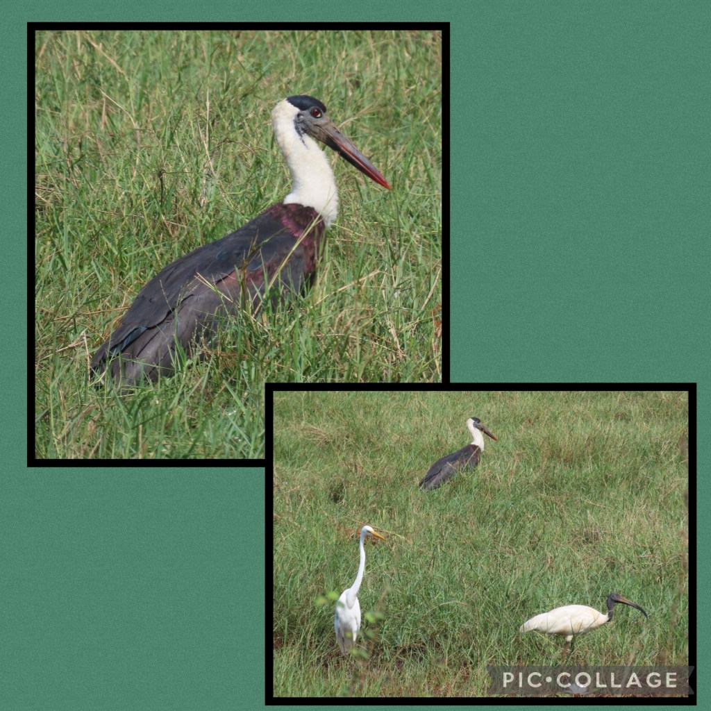 A Woolly-Necked Stork (top); A Great Egret, Black-Headed Ibis and Woolly-Necked Stork all in one shot – pretty cool!
