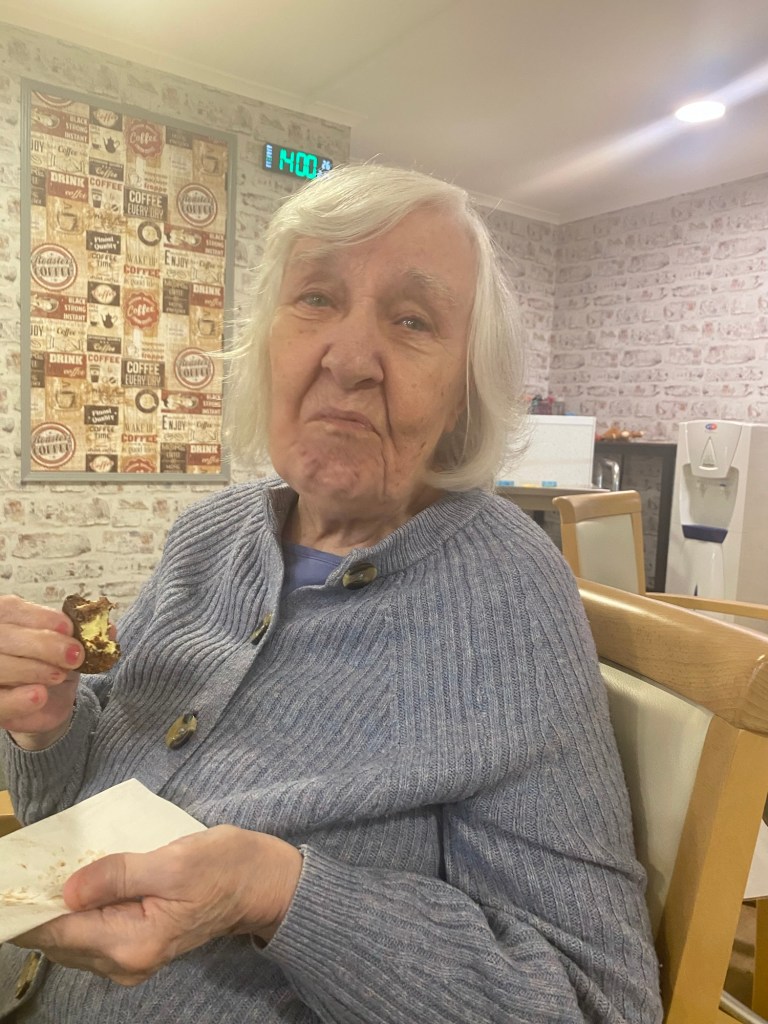 Anyway, although I haven’t managed to get back to see Mum this past week, I did see her on Valentines Day (Friday 14th) when we shared an Easter cake (what else!?) or, in Mum’s case, two Easter Cakes (of the Cadbury’s variety)! I am always astounded by how much my Mum can eat when it comes to anything sweet despite having just had her lunch (fish & chips plus dessert!) – it’s reassuring in a way although I think I might need to size-up her jogging pants!