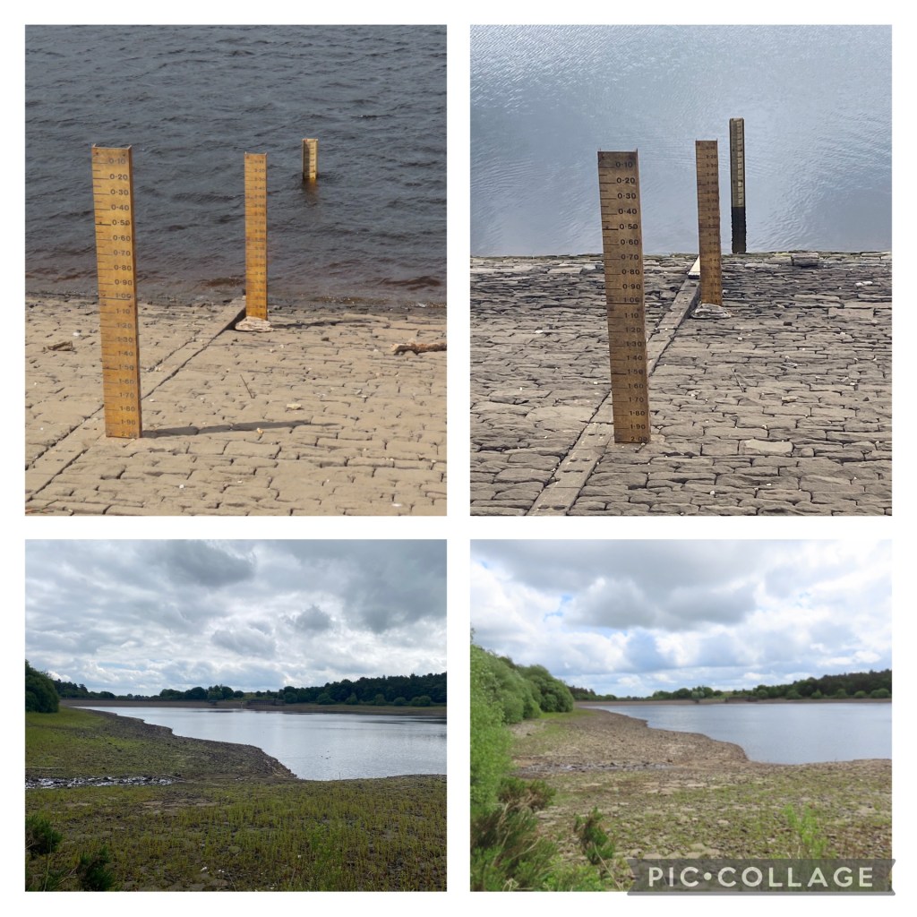 We also had a walk over at Ogden Reservoir in the week (25th) so Pete could pick up some veg plants at a nearby nursery… we were also interested to see how low the water levels are is at the moment now Yorkshire is officially in drought! See the pic below: