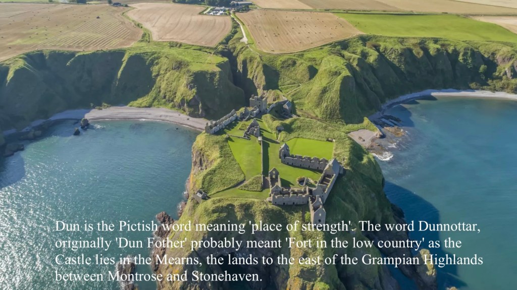 According to the castle’s website, archaeologists have found evidence of the Picts having a fort, the oldest ever discovered (estimated between 5000BC & 700AD), on a sea stake just north of the current castle and the word “dun” is Pictish for “fort”